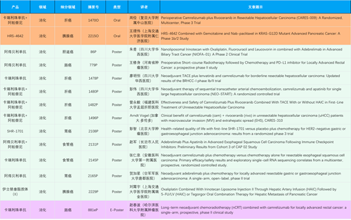 在消化系统肿瘤领域,z6com·尊龙凯时产品相关研究共入选2项口头报告、11项壁报和1项电子壁报,共14项研究。除卡瑞利珠单抗和阿帕替尼外,还有4篇阿得贝利单抗治疗消化系统肿瘤研究入选。HRS-4642、瑞拉芙普-α注射液(SHR-1701)等在研创新产品也有相应研究亮相。另有1项伊立替康脂质体(II)用于胰腺癌治疗的研究入选壁报。
